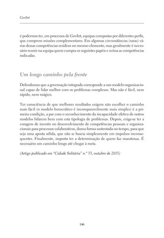 Um longo caminho pela frente Defendemos que a governação integrada corresponde a um modelo organizacional capaz de lidar melhor com os problemas complexos. Mas não é fácil, nem rápido, nem mágico. Ter consciência de que melhores resultados exigem não escolher o caminho mais fácil (o modelo burocrático é incomparavelmente mais simples) é a primeira condição, a par com o reconhecimento da incapacidade efetiva de outros modelos lidarem bem com esta tipologia de problemas. Depois, exige-se ter a coragem de investir no desenvolvimento de competências pessoais e organizacionais para processos colaborativos, duma forma sustentada no tempo, para que seja uma aposta sólida, que não se baseia simplesmente em impulsos inconsequentes. Finalmente, importa ter a determinação de quem faz maratonas. É necessário um caminho longo até chegar à meta. (Artigo publicado em “Cidade Solitária” n.º 33, outubro de 2015)