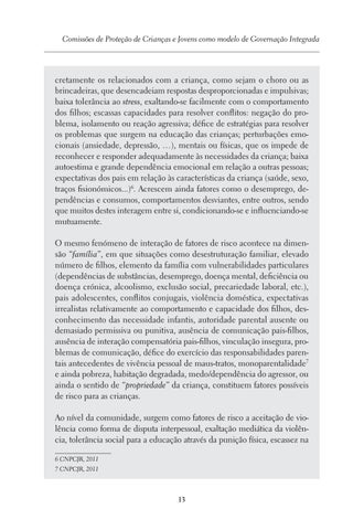 cretamente os relacionados com a criança, como sejam o choro ou as brincadeiras, que desencadeiam respostas desproporcionadas e impulsivas; baixa tolerância ao stress, exaltando-se facilmente com o comportamento dos filhos; escassas capacidades para resolver conflitos: negação do problema, isolamento ou reação agressiva; défice de estratégias para resolver os problemas que surgem na educação das crianças; perturbações emocionais (ansiedade, depressão, …), mentais ou físicas, que os impede de reconhecer e responder adequadamente às necessidades da criança; baixa autoestima e grande dependência emocional em relação a outras pessoas; expectativas dos pais em relação às características da criança (saúde, sexo, traços fisionómicos...)6. Acrescem ainda fatores como o desemprego, dependências e consumos, comportamentos desviantes, entre outros, sendo que muitos destes interagem entre si, condicionando-se e influenciando-se mutuamente. O mesmo fenómeno de interação de fatores de risco acontece na dimensão “família”, em que situações como desestruturação familiar, elevado número de filhos, elemento da família com vulnerabilidades particulares (dependências de substâncias, desemprego, doença mental, deficiência ou doença crónica, alcoolismo, exclusão social, precariedade laboral, etc.), pais adolescentes, conflitos conjugais, violência doméstica, expectativas irrealistas relativamente ao comportamento e capacidade dos filhos, desconhecimento das necessidade infantis, autoridade parental ausente ou demasiado permissiva ou punitiva, ausência de comunicação pais-filhos, ausência de interação compensatória pais-filhos, vinculação insegura, problemas de comunicação, défice do exercício das responsabilidades parentais antecedentes de vivência pessoal de maus-tratos, monoparentalidade7 e ainda pobreza, habitação degradada, medo/dependência do agressor, ou ainda o sentido de “propriedade” da criança, constituem fatores possíveis de risco para as crianças. Ao nível da comunidade, surgem como fatores de risco a aceitação de violência como forma de disputa interpessoal, exaltação mediática da violência, tolerância social para a educação através da punição física, escassez na 6 CNPCJR, 2011 7 CNPCJR, 2011