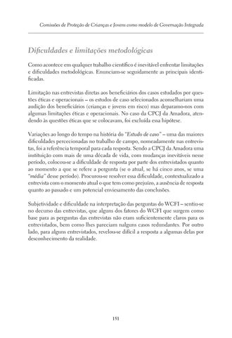 Dificuldades e limitações metodológicas Como acontece em qualquer trabalho científico é inevitável enfrentar limitações e dificuldades metodológicas. Enunciam-se seguidamente as principais identificadas. Limitação nas entrevistas diretas aos beneficiários dos casos estudados por questões éticas e operacionais – os estudos de caso selecionados aconselhariam uma audição dos beneficiários (crianças e jovens em risco) mas deparamo-nos com algumas limitações éticas e operacionais. No caso da CPCJ da Amadora, atendendo às questões éticas que se colocavam, foi excluída essa hipótese. Variações ao longo do tempo na história do “Estudo de caso” – uma das maiores dificuldades percecionadas no trabalho de campo, nomeadamente nas entrevistas, foi a referência temporal para cada resposta. Sendo a CPCJ da Amadora uma instituição com mais de uma década de vida, com mudanças inevitáveis nesse período, colocou-se a dificuldade de resposta por parte dos entrevistados quanto ao momento a que se refere a pergunta (se o atual, se há cinco anos, se uma “média” desse período). Procurou-se resolver essa dificuldade, contextualizado a entrevista com o momento atual o que tem como prejuízo, a ausência de resposta quanto ao passado e um potencial enviesamento das conclusões. Subjetividade e dificuldade na interpretação das perguntas do WCFI – sentiu-se no decurso das entrevistas, que alguns dos fatores do WCFI que surgem como base para as perguntas das entrevistas não eram suficientemente claros para os entrevistados, bem como lhes pareciam nalguns casos redundantes. Por outro lado, para alguns entrevistados, revelou-se difícil a resposta a algumas delas por desconhecimento da realidade.