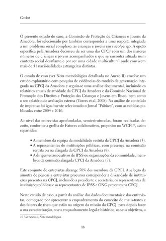 O presente estudo de caso, a Comissão de Proteção de Crianças e Jovens da Amadora, foi selecionado por também corresponder a uma resposta integrada a um problema social complexo: as crianças e jovens em risco/perigo. A opção específica pela Amadora decorreu de ser uma das CPCJ com um dos maiores números de crianças e jovens acompanhados e que se encontra situada num contexto social desafiante e por ser uma cidade multicultural onde convivem mais de 41 nacionalidades estrangeiras distintas. O estudo de caso (ver Nota metodológica detalhada no Anexo II) envolve um estudo exploratório com pesquisa de evidências do modelo de governação integrada na CPCJ da Amadora e seguiu-se uma análise documental, incluindo os relatórios anuais de atividade da CPCJ da Amadora e da Comissão Nacional de Promoção dos Direitos e Proteção das Crianças e Jovens em Risco, bem como o seu relatório de avaliação externa (Torres et al, 2008). Na análise de conteúdo de imprensa foi igualmente selecionado o Jornal “Público”, com as notícias publicadas entre 2004 e 2016. Ao nível das entrevistas aprofundadas, semiestruturadas, foram realizadas dezoito, conforme a grelha de Fatores colaborativos, propostos no WCFI10, assim repartidas: • A membros da equipa da modalidade restrita da CPCJ da Amadora (3). • A representantes de instituições públicas, com presença na comissão restrita ou na alargada da CPCJ da Amadora (8). • A dirigentes associativos de IPSS ou organizações da comunidade, membros da comissão alargada CPCJ da Amadora (7). Este conjunto de entrevistas abrange 50% dos membros da CPCJ. A seleção da amostra de pessoas a entrevistar procurou corresponder à diversidade de instituições presentes na CPCJ, incluindo a presidente e secretária, os representantes de instituições públicas e os representantes de IPSS e ONG presentes na CPCJ. Neste estudo de caso, a partir da análise dos dados documentais e das entrevistas, começa-se por apresentar o enquadramento do conceito de maus-tratos e dos fatores de risco que estão na origem da missão da CPCJ, para depois fazer a sua caracterização, o seu enquadramento legal e histórico, os seus objetivos, a 10 Ver Anexo II, Nota metodológica.
