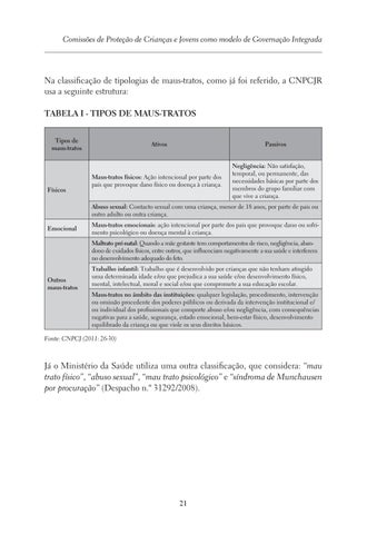 Na classificação de tipologias de maus-tratos, como já foi referido, a CNPCJR usa a seguinte estrutura: TABELA I - TIPOS DE MAUS-TRATOS Tipos de maus-tratos