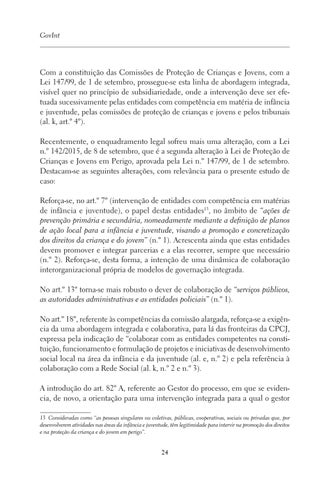 Com a constituição das Comissões de Proteção de Crianças e Jovens, com a Lei 147/99, de 1 de setembro, prossegue-se esta linha de abordagem integrada, visível quer no princípio de subsidiariedade, onde a intervenção deve ser efetuada sucessivamente pelas entidades com competência em matéria de infância e juventude, pelas comissões de proteção de crianças e jovens e pelos tribunais (al. k, art.º 4º). Recentemente, o enquadramento legal sofreu mais uma alteração, com a Lei n.º 142/2015, de 8 de setembro, que é a segunda alteração à Lei de Proteção de Crianças e Jovens em Perigo, aprovada pela Lei n.º 147/99, de 1 de setembro. Destacam-se as seguintes alterações, com relevância para o presente estudo de caso: Reforça-se, no art.º 7º (intervenção de entidades com competência em matérias de infância e juventude), o papel destas entidades13, no âmbito de “ações de prevenção primária e secundária, nomeadamente mediante a definição de planos de ação local para a infância e juventude, visando a promoção e concretização dos direitos da criança e do jovem” (n.º 1). Acrescenta ainda que estas entidades devem promover e integrar parcerias e a elas recorrer, sempre que necessário (n.º 2). Reforça-se, desta forma, a intenção de uma dinâmica de colaboração interorganizacional própria de modelos de governação integrada. No art.º 13º torna-se mais robusto o dever de colaboração de “serviços públicos, as autoridades administrativas e as entidades policiais” (n.º 1). No art.º 18º, referente às competências da comissão alargada, reforça-se a exigência da uma abordagem integrada e colaborativa, para lá das fronteiras da CPCJ, expressa pela indicação de “colaborar com as entidades competentes na constituição, funcionamento e formulação de projetos e iniciativas de desenvolvimento social local na área da infância e da juventude (al. e, n.º 2) e pela referência à colaboração com a Rede Social (al. k, n.º 2 e n.º 3). A introdução do art. 82º A, referente ao Gestor do processo, em que se evidencia, de novo, a orientação para uma intervenção integrada para a qual o gestor 13 Consideradas como “as pessoas singulares ou coletivas, públicas, cooperativas, sociais ou privadas que, por desenvolverem atividades nas áreas da infância e juventude, têm legitimidade para intervir na promoção dos direitos e na proteção da criança e do jovem em perigo”.