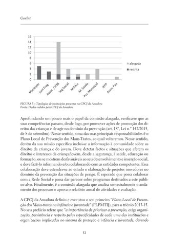 Aprofundando um pouco mais o papel da comissão alargada, verifica-se que as suas competências passam, desde logo, por promover ações de promoção dos direitos das crianças e de agir no domínio da prevenção (art. 18º, Lei n.º 142/2015, de 8 de setembro). Nesse sentido, uma das suas principais responsabilidades é o Plano Local de Prevenção dos Maus-Tratos, ao qual voltaremos. Nesse sentido, dentro da sua missão específica inclui-se a informação à comunidade sobre os direitos da criança e do jovem. Deve detetar factos e situações que afetem os direitos e interesses da criança/jovem, desde a segurança, à saúde, educação ou formação, ou se mostrem desfavoráveis ao seu desenvolvimento e inserção social, e deve fazê-lo informando e/ou colaborando com as entidades competentes. Essa colaboração deve estender-se ao estudo e elaboração de projetos inovadores no domínio da prevenção das situações de perigo. É esperado que possa colaborar com a Rede Social e possa dar parecer sobre programas destinados a este público-alvo. Finalmente, é a comissão alargada que analisa semestralmente o andamento dos processos e aprova o relatório anual de atividades e avaliação. A CPCJ da Amadora definiu e executou o seu primeiro “Plano Local de Prevenção dos Maus-tratos na infância e juventude” (PLPMTIJ), para o triénio 2013-15. No seu prefácio refere que “a importância de priorizar a prevenção, exige organização, persistência e respeito pelas especificidades de cada uma das instituições e organizações implicadas no sistema de proteção à infância e juventude, devendo 32