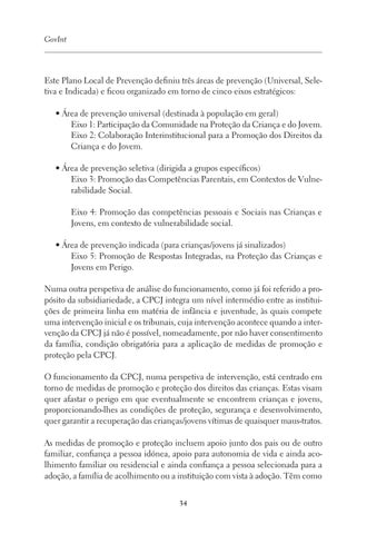 Este Plano Local de Prevenção definiu três áreas de prevenção (Universal, Seletiva e Indicada) e ficou organizado em torno de cinco eixos estratégicos: • Área de prevenção universal (destinada à população em geral) Eixo 1: Participação da Comunidade na Proteção da Criança e do Jovem. Eixo 2: Colaboração Interinstitucional para a Promoção dos Direitos da Criança e do Jovem. • Área de prevenção seletiva (dirigida a grupos específicos) Eixo 3: Promoção das Competências Parentais, em Contextos de Vulnerabilidade Social. Eixo 4: Promoção das competências pessoais e Sociais nas Crianças e Jovens, em contexto de vulnerabilidade social. • Área de prevenção indicada (para crianças/jovens já sinalizados) Eixo 5: Promoção de Respostas Integradas, na Proteção das Crianças e Jovens em Perigo. Numa outra perspetiva de análise do funcionamento, como já foi referido a propósito da subsidiariedade, a CPCJ integra um nível intermédio entre as instituições de primeira linha em matéria de infância e juventude, às quais compete uma intervenção inicial e os tribunais, cuja intervenção acontece quando a intervenção da CPCJ já não é possível, nomeadamente, por não haver consentimento da família, condição obrigatória para a aplicação de medidas de promoção e proteção pela CPCJ. O funcionamento da CPCJ, numa perspetiva de intervenção, está centrado em torno de medidas de promoção e proteção dos direitos das crianças. Estas visam quer afastar o perigo em que eventualmente se encontrem crianças e jovens, proporcionando-lhes as condições de proteção, segurança e desenvolvimento, quer garantir a recuperação das crianças/jovens vítimas de quaisquer maus-tratos. As medidas de promoção e proteção incluem apoio junto dos pais ou de outro familiar, confiança a pessoa idónea, apoio para autonomia de vida e ainda acolhimento familiar ou residencial e ainda confiança a pessoa selecionada para a adoção, a família de acolhimento ou a instituição com vista à adoção. Têm como 34
