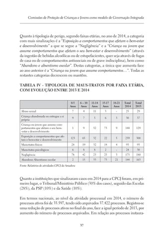 Quanto a instituições que sinalizaram casos em 2014 para a CPCJ foram, em primeiro lugar, o Tribunal/Ministério Público (30% dos casos), seguido das Escolas (28%), da PSP (10%) e da Saúde (10%). Em termos nacionais, ao nível da atividade processual em 2014, o número de processos ativos foi de 35.597, tendo sido arquivados 37.422 processos. Registou-se uma redução de processos ativos no final do ano, face a igual período de 2013, por aumento do número de processos arquivados. Em relação aos processos instaura37