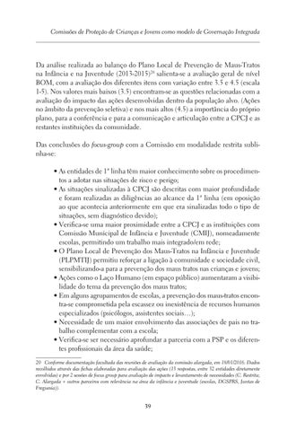Da análise realizada ao balanço do Plano Local de Prevenção de Maus-Tratos na Infância e na Juventude (2013-2015)20 salienta-se a avaliação geral de nível BOM, com a avaliação dos diferentes itens com variação entre 3.5 e 4.5 (escala 1-5). Nos valores mais baixos (3.5) encontram-se as questões relacionadas com a avaliação do impacto das ações desenvolvidas dentro da população alvo. (Ações no âmbito da prevenção seletiva) e nos mais altos (4.5) a importância do próprio plano, para a conferência e para a comunicação e articulação entre a CPCJ e as restantes instituições da comunidade. Das conclusões do focus-group com a Comissão em modalidade restrita sublinha-se: • As entidades de 1ª linha têm maior conhecimento sobre os procedimentos a adotar nas situações de risco e perigo; • As situações sinalizadas à CPCJ são descritas com maior profundidade e foram realizadas as diligências ao alcance da 1ª linha (em oposição ao que acontecia anteriormente em que era sinalizadas todo o tipo de situações, sem diagnóstico devido); • Verifica-se uma maior proximidade entre a CPCJ e as instituições com Comissão Municipal de Infância e Juventude (CMIJ), nomeadamente escolas, permitindo um trabalho mais integrado/em rede; • O Plano Local de Prevenção dos Maus-Tratos na Infância e Juventude (PLPMTIJ) permitiu reforçar a ligação à comunidade e sociedade civil, sensibilizando-a para a prevenção dos maus tratos nas crianças e jovens; • Ações como o Laço Humano (em espaço público) aumentaram a visibilidade do tema da prevenção dos maus tratos; • Em alguns agrupamentos de escolas, a prevenção dos maus-tratos encontra-se comprometida pela escassez ou inexistência de recursos humanos especializados (psicólogos, assistentes sociais…); • Necessidade de um maior envolvimento das associações de pais no trabalho complementar com a escola; • Verifica-se ser necessário aprofundar a parceria com a PSP e os diferentes profissionais da área da saúde; 20 Conforme documentação facultada das reuniões de avaliação da comissão alargada, em 18/01/2016. Dados recolhidos através das fichas elaboradas para avaliação das ações (13 respostas, entre 32 entidades diretamente envolvidas) e por 2 sessões de focus group para avaliação de impacto e levantamento de necessidades (C. Restrita; C. Alargada + outros parceiros com relevância na área da infância e juventude (escolas, DGSPRS, Juntas de Freguesia)).