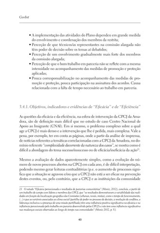 3.4.1. Objetivos, indicadores e evidências de “Eficácia” e de “Eficiência” As questões da eficácia e da eficiência, na esfera de intervenção da CPCJ da Amadora, são de definição mais difícil que no estudo de caso Centro Nacional de Apoio ao Imigrante (CNAI). Em si mesmo, o problema complexo sobre a qual age a CPCJ é mais denso e a intervenção que lhe é pedida, mais complexa. Vale a pena, por exemplo, ter em conta as páginas, onde a partir da análise de imprensa, de notícias referentes a temáticas correlacionadas com a CPCJ da Amadora, no domínio referente “complexidade decorrente da natureza dos casos”, se mostra como é difícil a abordagem do tema sucesso/insucesso ou de eficácia/ineficácia da ação21. Mesmo a avaliação de dados aparentemente simples, como a evolução do número de novos processos abertos na CPCJ em cada ano, é de difícil interpretação, podendo mesmo gerar leituras contraditórias (p.e. o aumento de processos significa que a situação se agravou e/ou que a CPCJ não está a ser eficaz na prevenção destes eventos, ou, pelo contrário, que a CPCJ e as instituições da comunidade 21 O estudo “Eficácia percecionada e resultados de parcerias comunitárias” (Moniz, 2012), concluía, a partir de um trabalho de campo com líderes e membros das CPCJ, que “os resultados demonstraram a variabilidade das realidades em função da localização geográfica das Comissões (urbanas, rurais, mistas), como o tempo de funcionamento, (...) e que as variáveis associadas ao clima social (partilha de poder no processo de decisão, a resolução de conflitos, a liderança inclusiva e a presença de uma missão partilhada) têm uma influência positiva significativa na eficácia e na influência percecionada pelo trabalho em parceria desenvolvido pelas CPCJ’s e não tem uma influência significativa nas mudanças sociais observadas ao longo do tempo nas comunidades” (Moniz 2012, p. V).