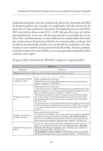 Analisando esta grelha, uma das evidências da eficácia da intervenção da CPCJ da Amadora poderia, por exemplo, ser medida pelo indicador decorrente do rácio entre nº casos reabertos/nº casos ativos. Dos dados disponíveis entre 2012 e 2014, esse número situa-se entre 8,3% e 11,4%. Isso quer dizer que, em média, aproximadamente, só um em cada dez processos teve necessidade de ser reaberto. Mas, simultaneamente, e como evidência da complexidade desta temática, o baixo número de processos reabertos, em si mesmo, pode ser não ser sinal da eficácia da intervenção anterior, mas sim de falta de sinalização e de intervenção em novas ocorrências que possam ter ficado ocultas. Torna-se, portanto, necessário analisar com maior detalhe, caso a caso, para poder interpretar melhor a eficácia, neste aspeto. No que se refere à dimensão da “Eficiência”, propõe-se a seguinte análise: Eficiência Indicadores