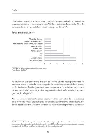 Na análise de conteúdo neste universo de vinte e quatro peças procurou-se ter em conta, como já referido, duas categorias de conteúdos: os associados à evidência do fenómeno de crianças e jovens em perigo como de problema social complexo e os associados a relações interorganizacionais de colaboração, enquanto governação integrada25. As peças jornalísticas identificadas encerram várias expressões da complexidade deste problema social, captadas pelo jornalista na construção da sua narrativa. Podemos identificar três universos distintos da natureza deste problema complexo: