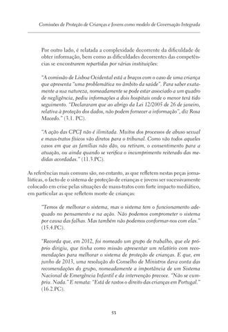Por outro lado, é relatada a complexidade decorrente da dificuldade de obter informação, bem como as dificuldades decorrentes das competências se encontrarem repartidas por várias instituições: “A comissão de Lisboa Ocidental está a braços com o caso de uma criança que apresenta “uma problemática no âmbito da saúde”. Para saber exatamente a sua natureza, nomeadamente se pode estar associado a um quadro de negligência, pediu informações a dois hospitais onde o menor terá tido seguimento. “Declararam que ao abrigo da Lei 12/2005 de 26 de janeiro, relativa à proteção dos dados, não podem fornecer a informação”, diz Rosa Macedo.” (3.1. PC). “A ação das CPCJ não é ilimitada. Muitos dos processos de abuso sexual e maus-tratos físicos vão diretos para o tribunal. Como vão todos aqueles casos em que as famílias não dão, ou retiram, o consentimento para a atuação, ou ainda quando se verifica o incumprimento reiterado das medidas acordadas.” (11.3.PC). As referências mais comuns são, no entanto, as que refletem nestas peças jornalísticas, o facto de o sistema de proteção de crianças e jovens ser sucessivamente colocado em crise pelas situações de maus-tratos com forte impacto mediático, em particular as que refletem morte de crianças: “Temos de melhorar o sistema, mas o sistema tem o funcionamento adequado no pensamento e na ação. Não podemos comprometer o sistema por causa das falhas. Mas também não podemos conformar-nos com elas.” (15.4.PC). “Recorda que, em 2012, foi nomeado um grupo de trabalho, que ele próprio dirigiu, que tinha como missão apresentar um relatório com recomendações para melhorar o sistema de proteção de crianças. E que, em junho de 2013, uma resolução do Conselho de Ministros dava conta das recomendações do grupo, nomeadamente a importância de um Sistema Nacional de Emergência Infantil e da intervenção precoce. “Não se cumpriu. Nada.” E remata: “Está de rastos o direito das crianças em Portugal.” (16.2.PC).