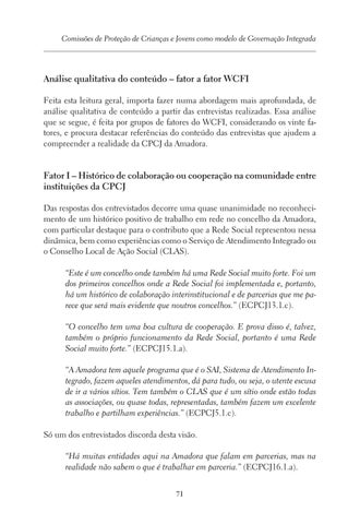 Análise qualitativa do conteúdo – fator a fator WCFI Feita esta leitura geral, importa fazer numa abordagem mais aprofundada, de análise qualitativa de conteúdo a partir das entrevistas realizadas. Essa análise que se segue, é feita por grupos de fatores do WCFI, considerando os vinte fatores, e procura destacar referências do conteúdo das entrevistas que ajudem a compreender a realidade da CPCJ da Amadora.