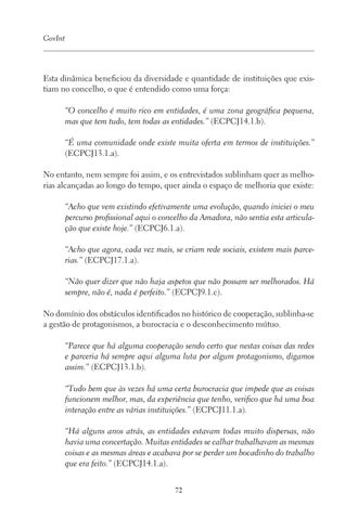 Esta dinâmica beneficiou da diversidade e quantidade de instituições que existiam no concelho, o que é entendido como uma força: “O concelho é muito rico em entidades, é uma zona geográfica pequena, mas que tem tudo, tem todas as entidades.” (ECPCJ14.1.b). “É uma comunidade onde existe muita oferta em termos de instituições.” (ECPCJ13.1.a). No entanto, nem sempre foi assim, e os entrevistados sublinham quer as melhorias alcançadas ao longo do tempo, quer ainda o espaço de melhoria que existe: “Acho que vem existindo efetivamente uma evolução, quando iniciei o meu percurso profissional aqui o concelho da Amadora, não sentia esta articulação que existe hoje.” (ECPCJ6.1.a). “Acho que agora, cada vez mais, se criam rede sociais, existem mais parcerias.” (ECPCJ17.1.a). “Não quer dizer que não haja aspetos que não possam ser melhorados. Há sempre, não é, nada é perfeito.” (ECPCJ9.1.c). No domínio dos obstáculos identificados no histórico de cooperação, sublinha-se a gestão de protagonismos, a burocracia e o desconhecimento mútuo. “Parece que há alguma cooperação sendo certo que nestas coisas das redes e parceria há sempre aqui alguma luta por algum protagonismo, digamos assim.” (ECPCJ13.1.b). “Tudo bem que às vezes há uma certa burocracia que impede que as coisas funcionem melhor, mas, da experiência que tenho, verifico que há uma boa interação entre as várias instituições.” (ECPCJ11.1.a). “Há alguns anos atrás, as entidades estavam todas muito dispersas, não havia uma concertação. Muitas entidades se calhar trabalhavam as mesmas coisas e as mesmas áreas e acabava por se perder um bocadinho do trabalho que era feito.” (ECPCJ14.1.a). 72
