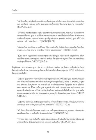 “As famílias ainda têm muito medo do que nós fazemos, tem vindo a melhorar também, mas eu acho que tem muito medo do que é que é a comissão.” (ECPCJ12.2.b). “Porque, muitas vezes, o que acontece é que conhecem, mas não o conhecem no sentido em que se calhar muitas vezes as entidades tinham as mesmas ideias de senso comum como qualquer outra pessoa, não é, que ah! Vão retirar…ah! Vão fazer…” (ECPCJ14.2.b). “A nível de famílias, se calhar é tipo um bicho papão para aquelas famílias mais… (...) ou seja a função é retirar as crianças.” (ECPCJ11.2.a). “Que é um organismo que cumpre uma função e que é um organismo aborrecido e que só serve para chatear a vida das pessoas e para lhes causar ainda mais problemas.” (ECPCJ10.2.a). Regista-se, no entanto, que esta perceção tem vindo a melhorar, sobretudo fruto da maior abertura, em consequência do trabalho da equipa da CPCJ feito junto da comunidade: “Aquilo que vimos nessa altura (diagnóstico em 2010) foi que a comunidade nos via ainda como uma instituição pouco fechada, sobre si própria, e que era preciso dar passos no sentido de estabelecermos ligações mais efetivas com o exterior. E eu acho que a partir daí, nós começamos a fazer um percurso de abertura e até de captação dessa responsabilidade social que todos temos nessa questão da promoção e proteção das crianças e jovens.” (ECPCJ15.2.a). “A forma como as instituições veem a comissão tem vindo a mudar porque a comissão tem-se implantado no território.” (ECPCJ13.2.a). “O facto de trabalharmos muito em rede permite que as pessoas vão conhecendo melhor o trabalho das comissões.” (ECPCJ12.2.c). “Temos tido esse trabalho aqui na comissão, de abertura à comunidade, de apresentar e de fazer conhecer o nosso trabalho.” (ECPCJ14.2.a).