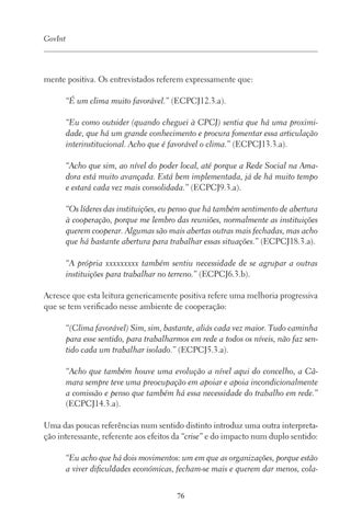 mente positiva. Os entrevistados referem expressamente que: “É um clima muito favorável.” (ECPCJ12.3.a). “Eu como outsider (quando cheguei à CPCJ) sentia que há uma proximidade, que há um grande conhecimento e procura fomentar essa articulação interinstitucional. Acho que é favorável o clima.” (ECPCJ13.3.a). “Acho que sim, ao nível do poder local, até porque a Rede Social na Amadora está muito avançada. Está bem implementada, já de há muito tempo e estará cada vez mais consolidada.” (ECPCJ9.3.a). “Os líderes das instituições, eu penso que há também sentimento de abertura à cooperação, porque me lembro das reuniões, normalmente as instituições querem cooperar. Algumas são mais abertas outras mais fechadas, mas acho que há bastante abertura para trabalhar essas situações.” (ECPCJ18.3.a). “A própria xxxxxxxxx também sentiu necessidade de se agrupar a outras instituições para trabalhar no terreno.” (ECPCJ6.3.b). Acresce que esta leitura genericamente positiva refere uma melhoria progressiva que se tem verificado nesse ambiente de cooperação: “(Clima favorável) Sim, sim, bastante, aliás cada vez maior. Tudo caminha para esse sentido, para trabalharmos em rede a todos os níveis, não faz sentido cada um trabalhar isolado.” (ECPCJ5.3.a). “Acho que também houve uma evolução a nível aqui do concelho, a Câmara sempre teve uma preocupação em apoiar e apoia incondicionalmente a comissão e penso que também há essa necessidade do trabalho em rede.” (ECPCJ14.3.a). Uma das poucas referências num sentido distinto introduz uma outra interpretação interessante, referente aos efeitos da “crise” e do impacto num duplo sentido: “Eu acho que há dois movimentos: um em que as organizações, porque estão a viver dificuldades económicas, fecham-se mais e querem dar menos, cola76
