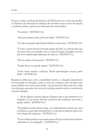 No que se refere à avaliação da dinâmica da CPCJ neste eixo, existe uma tendência fortíssima de afirmação da satisfação dos membros com os níveis de respeito e confiança mútua, expressa nas afirmações dos entrevistados: “É excelente.” (ECPCJ15.4.a). “Acho que estamos muito acima da média.” (ECPCJ12.4.a). “Eu noto um grande respeito pelo trabalho uns dos outros.” (ECPCJ12.4.b). “É assim o ponto forte da Comissão porque de facto, eu costumo dizer que nós somos como uma família, não é, em que há regras, há papéis, mas tem que haver respeito pelas diferenças de cada um.” (ECPCJ15.4.a). “Há um respeito muito grande.” (ECPCJ4.4.b). “Sempre houve um grande respeito.” (ECPCJ14.4.b). “Existe muito respeito, confiança. Muita aprendizagem comum, partilhada.” (ECPCJ6.4.b). Registam-se diferenças entre a modalidade restrita e a alargada, dependentes da intensidade de interação, sendo os níveis de confiança mais elevados entre quem trabalha com maior proximidade, sem prejuízo do esforço que tem vindo a ser feito para aumentar estes níveis de confiança também entre os membros da comissão alargada: “... Há de alguma maneira alguma clivagem entre os que pertencem só à alargada e os da restrita. Há este sentimento (de confiança) mais entre a equipa restrita.” (ECPCJ13.4.a). “Da perfeição ainda estamos longe, mas especialmente aquelas que mais contribuem, as que estão mais presentes, eu noto que se esforçam (para construir relações de confiança).” (ECPCJ11.4.a). “É uma relação positiva, mas mesmo assim acho que ainda é pouco próxima (referindo-se à com alargada).” (ECPCJ16.4.a). 78