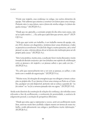 “Existe esse respeito, essa confiança no colega, nos outros elementos da equipa. Nós sabemos que estamos a construir um futuro para uma criança. Portanto não é o meu futuro, nem o futuro da minha colega: é o futuro daquela criança.” (ECPCJ10.4.c). “Desde que me apercebo, a comissão sempre foi dos sítios mais coesos, não sei se é pelo motivo (…) Eu acho que é pelo bem que servem, não é?” (ECPCJ2.4.a). “Acho que aqui existe um trabalho, é um trabalho mesmo de equipa, nós, em 2012, fizemos um diagnóstico, tentámos fazer umas dinâmicas e todos os parceiros se envolveram. Foi fácil de chegar a outros parceiros, até a nível pessoal, ou seja, o técnico deixou de ser só técnico da instituição para ser ele próprio pela causa.” (ECPCJ1.4.a). “Isto é uma prática, muitos anos, e acaba por haver muita discussão e muita tomada de decisão conjunta e por isso fortalece esse espirito de colaboração entre as pessoas e de respeito e as pessoas sabem o que cada um faz...” (ECPCJ3.4.a). “Eu acho que essencialmente tem a ver com as pessoas, se calhar, e não tanto com o modelo de organização.” (ECPCJ15.4.a). “Muitas vezes, há situações de emergência que nos obrigam a tomar a situações no próprio dia. E se é preciso ir levar uma criança ao Porto ou a Coimbra, qualquer um está disponível, portanto não se coloca a questão de: “eu fui ontem” ou “eu fui a semana passada não vou agora.” (ECPCJ15.4.d). Ainda neste domínio da construção de relações de confiança, são referidas como relevantes a fase do acolhimento, o sentimento de proximidade, a ausência de julgamento pessoal, a aceitação de perspetivas diferentes: “Desde que estou aqui a representar a xxxxxx, senti um acolhimento muito bom, senti-me muito bem acolhida e depois mesmo em termos do nosso trabalho, confio plenamente nas colegas e partilhamos muita informação.” (ECPCJ6.4.a).