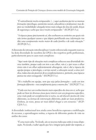 “É naturalmente muito enriquecedor. (...) aqui acabamos por ter as mesmas formações (psicólogas, assistentes sociais, educadoras e professoras) mas depois na (modalidade) alargada temos mais colegas da área da saúde, forças de segurança e acho que isso é muito enriquecedor.” (ECPCJ13.5.a). “A riqueza passa precisamente aí, eles conhecem os contextos aos quais nós não temos qualquer acesso e que depois partilhando essa informação nos dão uma compreensão muito maior de cada família e de cada situação.” (ECPCJ4.5.c). A dimensão da interação interdisciplinar é muito referenciada enquanto mais-valia desta diversidade de membros da CPCJ e dos respetivos perfis profissionais, particularmente para os casos mais complexos: “Aqui neste tipo de situações mais complexas coloca-se essa diversidade técnica também, porque cada um tem o seu olhar, não é, e por vezes o olhar único não é um olhar suficientemente abrangente, não é, daí a riqueza da equipa porque a psicologia, o serviço social, a educação social, a área jurídica, todas elas são possíveis de se complementarem e, portanto, essa riqueza parece-me estar conseguida.” (ECPCJ15.5.c). “Só o trabalho em equipa, nem que seja pelas formações – cada um tem formação diferente – nos complementa para o mesmo fim.” (ECPCJ17.5.a). “Cada um traz um conhecimento mais específico da área em si, acho que pode ser bom ter diversas áreas para intervir com um programa específico, uma visão pode ser complementar à outra, ou até discutir pontos de vista diferentes, ou formas de intervenção diferentes, pode ser mais produtivo. Embora, às vezes, possa ser mais difícil chegar a um consenso.” (ECPCJ18.5.c). A diversidade institucional tem ainda como benefícios expressos a mobilização de recursos, a aprendizagem mútua, a riqueza de diferentes pontos de vista na análise dos casos: “É uma mais-valia. No fundo, são os recursos todos que estão à nossa disposição. No fundo, é saber aquilo que há e integrar para poder dar resposta, a 83