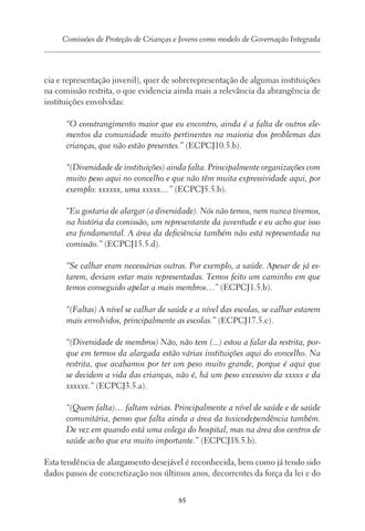 cia e representação juvenil), quer de sobrerepresentação de algumas instituições na comissão restrita, o que evidencia ainda mais a relevância da abrangência de instituições envolvidas: “O constrangimento maior que eu encontro, ainda é a falta de outros elementos da comunidade muito pertinentes na maioria dos problemas das crianças, que não estão presentes.” (ECPCJ10.5.b). “(Diversidade de instituições) ainda falta. Principalmente organizações com muito peso aqui no concelho e que não têm muita expressividade aqui, por exemplo: xxxxxx, uma xxxxx…” (ECPCJ5.5.b). “Eu gostaria de alargar (a diversidade). Nós não temos, nem nunca tivemos, na história da comissão, um representante da juventude e eu acho que isso era fundamental. A área da deficiência também não está representada na comissão.” (ECPCJ15.5.d). “Se calhar eram necessárias outras. Por exemplo, a saúde. Apesar de já estarem, deviam estar mais representadas. Temos feito um caminho em que temos conseguido apelar a mais membros…” (ECPCJ1.5.b). “(Faltas) A nível se calhar de saúde e a nível das escolas, se calhar estarem mais envolvidos, principalmente as escolas.” (ECPCJ17.5.c). “(Diversidade de membros) Não, não tem (...) estou a falar da restrita, porque em termos da alargada estão várias instituições aqui do concelho. Na restrita, que acabamos por ter um peso muito grande, porque é aqui que se decidem a vida das crianças, não é, há um peso excessivo da xxxxx e da xxxxxx.” (ECPCJ3.5.a). “(Quem falta)… faltam várias. Principalmente a nível de saúde e de saúde comunitária, penso que falta ainda a área da toxicodependência também. De vez em quando está uma colega do hospital, mas na área dos centros de saúde acho que era muito importante.” (ECPCJ18.5.b). Esta tendência de alargamento desejável é reconhecida, bem como já tendo sido dados passos de concretização nos últimos anos, decorrentes da força da lei e do 85