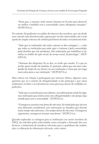 “Penso que, a maioria, sente mesmo interesse em lá estar para desenvolver melhor o trabalho com a comunidade e para ultrapassar situações.” (ECPC18.6.a). No entanto, há gradientes na análise do interesse dos membros, que vão desde uma variante mais desinteressada, expressa por um dos entrevistados, até à visão oposta de simples interesse de retribuição/retorno de todo o investimento feito: “Acho que as instituições não estão a pensar se têm vantagens (...) acho que todas as instituições que estão aqui o interesse é pela comunidade, pelas famílias que nós atendemos. São instituições que trabalham as famílias no âmbito da ação social, de serviço social, da psicologia.” (ECPCJ9.6.b). “(Interesse dos dirigentes) Se eu dou, eu tenho que receber. E o que eu recebo, quero receber de imediato. E, portanto, sabem que vão estar a despender de tempo do seu técnico na sua instituição e é bom que isso traga mais-valias para a sua instituição.” (ECPCJ13.6.a). Mais céticos em relação à participação por interesse efetivo, algumas vozes apontam que só o carácter de obrigatoriedade os faz participar e que várias instituições revelam o seu desinteresse nessa presença através de múltiplos expedientes: “Acho que se caminha para esse objetivo, mas efetivamente ainda há algumas instituições que sentem como uma obrigatoriedade e não porque faça sentido para com a comunidade.” (ECPC6.6.a). “Consegue-se arranjar uma forma de não estar, há instituições que até com uma dimensão considerável, com intervenção na Amadora que durante muito tempo não estiveram, e há sempre forma de não estar. Consegue-se argumentar, consegue-se arranjar uma forma.” (ECPC2.6.a). Quando exploradas as vantagens para as instituições em serem membros da CPCJ, são referidos pelos entrevistados como exemplos a formação dos seus técnicos, o tratamento de temáticas relevantes para o quotidiano das instituições e a obtenção de informação relevante, entre outros: 87