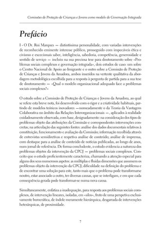 Prefácio I - O Dr. Rui Marques — distintíssima personalidade, com variadas intervenções de reconhecido eminente interesse público, prosseguido com impecáveis ética e civismo e excecionais saber, inteligência, sabedoria, competência, generosidade e sentido de serviço — incluiu na sua preciosa tese para doutoramento sobre «Problemas sociais complexos e governação integrada», dois estudos de caso: um sobre o Centro Nacional de Apoio ao Imigrante e o outro sobre a Comissão de Proteção de Crianças e Jovens da Amadora, ambos inseridos na vertente qualitativa da abordagem metodológica escolhida para a resposta à pergunta de partida para a sua tese de doutoramento — «Qual o modelo organizacional adequado face a problemas sociais complexos?» O estudo sobre a Comissão de Proteção de Crianças e Jovens da Amadora, ao qual se refere esta breve nota, foi desenvolvido com o rigor e a criatividade habituais, partindo de modelos teóricos inovadores —nomeadamente o da Teoria da Vantagem Colaborativa no âmbito das Relações Interorganizacionais —, aplicados à realidade cuidadosamente observada, com base, designadamente: na consideração dos tipos de problemas objeto das atribuições da Comissão e correspondentes intervenções concretas; na articulação das seguintes fontes: análise dos dados documentais relativos à constituição, funcionamento e avaliação da Comissão; informação recolhida através de entrevistas semidiretivas e respetiva análise de conteúdo; análise de imprensa, com destaque para a análise de conteúdo de notícias publicadas, ao longo de anos, num jornal de referência. De forma concludente, o estudo evidencia a natureza dos problemas objetos da intervenção da CPCJ — problemas sociais complexos. Conceito que o estudo proficientemente caracteriza, chamando a atenção especial para alguns dos seus numerosos aspetos: as múltiplas e fluidas dimensões que assumem os problemas objeto da intervenção da CPCJ; dificuldade na definição do problema e de encontrar uma solução para este, tanto mais que o problema pode transformarse noutro, estar associado a outro, ter diversas causas, que se interligam, e em que cada consequência gerada pode transformar-se numa nova causa. Simultaneamente, enfatiza a inadequação, para resposta aos problemas sociais complexos, de intervenção lineares, isoladas, em «silos», fruto de uma perspetiva exclusivamente burocrática, de índole meramente hierárquica, desgarrada de intervenções heterárquicas, de proximidade.