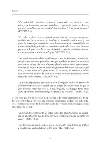 “Por outro lado, também em termos da comissão, se está a fazer um esforço de formação, dos seus membros, e, portanto, para os elementos que trabalham nessas instituições também é bom participarem.” (ECPC3.6.b). “Eu achei o plano de prevenção de maus-tratos de crianças era algo que também me interessava, e daí também ter investido muito mais (...) o facto de haver aqui um objetivo e um levantamento das necessidades e a forma como foi organizado, ao envolver as entidades todas para fazerem parte da solução, para haver um diagnóstico, isso foi muito importante, e com propostas também de soluções.” (ECPC8.6.b). “Na comissão nós também partilhamos. Além de formações, seminários, nós fazemos reuniões periódicas em que também estamos em contacto uns com os outros. Às vezes dá para abordar certos casos, certos temas, que tipo de resposta que em conjunto podemos dar a esta situação, quer dizer, é uma mais-valia para todos. E, às vezes, há serviços e valências novas que através da comissão, destas reuniões periódicas, vamos tomando conhecimento.” (ECPC17.6.c). “A minha experiência considero única. Enriqueci muito em termos de conhecimento, no aspeto social, até no aspeto de compreensão do que se passa muitas vezes nas escolas, e que, de facto, esta ligação torna mais clara e permitirá até ir mais longe na procura de soluções.” (ECPC7.6.b). Mesmo no quadro de interesse na presença e do reconhecimento dos benefícios decorrentes, é referido que algumas instituições evidenciam dificuldades, sobretudo ao nível da disponibilização de técnicos para participação nas atividades da CPCJ. “A minha disponibilidade, às vezes, não é tão grande quanto eu desejaria ou quanto acho que poderia ser mais rentável para este trabalho em rede.” (ECPC4.6.a). “Na teoria as entidades sabem que é importante, mas depois na prática é complicado disponibilizarem técnicos.” (ECPC14.6.a).