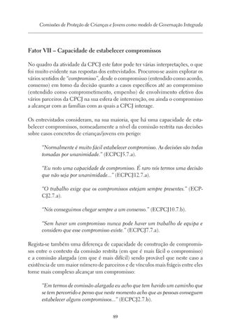 Fator VII – Capacidade de estabelecer compromissos No quadro da atividade da CPCJ este fator pode ter várias interpretações, o que foi muito evidente nas respostas dos entrevistados. Procurou-se assim explorar os vários sentidos de “compromisso”, desde o compromisso (entendido como acordo, consenso) em torno da decisão quanto a casos específicos até ao compromisso (entendido como comprometimento, empenho) de envolvimento efetivo dos vários parceiros da CPCJ na sua esfera de intervenção, ou ainda o compromisso a alcançar com as famílias com as quais a CPCJ interage. Os entrevistados consideram, na sua maioria, que há uma capacidade de estabelecer compromissos, nomeadamente a nível da comissão restrita nas decisões sobre casos concretos de crianças/jovens em perigo: “Normalmente é muito fácil estabelecer compromisso. As decisões são todas tomadas por unanimidade.” (ECPCJ5.7.a). “Eu noto uma capacidade de compromisso. É raro nós termos uma decisão que não seja por unanimidade...” (ECPCJ12.7.a). “O trabalho exige que os compromissos estejam sempre presentes.” (ECPCJ2.7.a). “Nós conseguimos chegar sempre a um consenso.” (ECPCJ10.7.b). “Sem haver um compromisso nunca pode haver um trabalho de equipa e considero que esse compromisso existe.” (ECPCJ7.7.a). Regista-se também uma diferença de capacidade de construção de compromissos entre o contexto da comissão restrita (em que é mais fácil o compromisso) e a comissão alargada (em que é mais difícil) sendo provável que neste caso a existência de um maior número de parceiros e de vínculos mais frágeis entre eles torne mais complexo alcançar um compromisso: “Em termos de comissão alargada eu acho que tem havido um caminho que se tem percorrido e penso que neste momento acho que as pessoas conseguem estabelecer alguns compromissos...” (ECPCJ2.7.b). 89