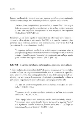 Fator VIII – Membros partilham a participação no processo e nos resultados A efetiva participação dos membros da CPCJ, quer no processo, quer nos resultados, é muito evidente nas respostas dos entrevistados, não só nesta questão específica, como também noutras. Essa participação resulta de uma dinâmica intencional, não-diretiva, com a construção de momentos e de dinâmicas para estimular e efetivar a participação e a permanente convocatória para a presença e envolvimento: “Há aqui um envolvimento grande, quer nas decisões, quer depois nos resultados.” (ECPCJ12.8.b.). “Perguntam sempre se queremos fazer propostas, o quê que achamos das atividades...” (ECPCJ18.8.a.). “Nesta equipa não há essa imposição, não há essa diretividade, há sim… “vamos ouvir todos, vamos perceber porquê que eu estava a pensar “assim” e tu a pensares “assado” e então se fizermos assim para ir”… Chegar ao consenso acaba por ser possível.” (ECPCJ13.8.a). 92