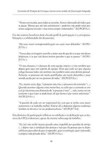 “Somos convocadas, para todas as reuniões. Somos informados de tudo o que se passa. Mesmo que até não estivéssemos – podemos não poder estar presentes nalguma reunião – mas somos sempre (informados).” (ECPCJ9.8.a.). Um dos maiores benefícios deste elevado perfil de participação é a corresponsabilização e a solidariedade daí decorrentes: “Há uma maior corresponsabilização nos casos mais debatidos.” (ECPCJ13.8.c.). “Nunca fica cá ninguém sozinho a tratar seja do que for e os que não ficam telefonam, e os que não ficam tentam perceber o que se passou.” (ECPCJ12.8.c.). “O meu fracasso é o fracasso de uma equipa inteira e é isto também que depois gera aqui este espírito de equipa. Sinto que cada vez que alguma colega fracassa todas nós sentimos isso também como uma derrota pessoal. Portanto, os processos são muito partilhados, são muito discutidos e nesse sentido acaba por ser um processo de todos.” (ECPCJ10.8.a.). “Eu, muitas vezes, digo, “o processo não é teu, o processo é da comissão” (...) Quando acontece alguma coisa menos boa, eu acho que a comissão se une e aí já não temos essa dimensão de “o processo é meu”..., não, vamos ver em conjunto o que é que se pode fazer, de que forma é que vamos solucionar.” (ECPCJ14.8.c.). “A questão de cada um ser responsável faz com que se tenha uma maior autonomia e se trabalhe melhor. Está-se ali a depositar alguma confiança também no técnico e no seu profissionalismo.” (ECPCJ17.8.d). Esta dinâmica de participação reflete-se na satisfação e na dedicação que os técnicos da CPCJ evidenciam, apesar da enorme sobrecarga de trabalho: “Eu (só) não venho mesmo quando estou impedido por questões de serviço (...) depois vejo a satisfação das pessoas e vejo que há pessoas que se disponibilizam para além do que (é esperado), quer à instituição, quer (retirando) à própria vida privada delas.” (ECPC11.8.a.). 93