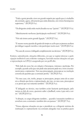 “Toda a gente percebe e tem um grande respeito por aquilo que é o trabalho da comissão, agora, obviamente que estão distantes, sim (níveis hierárquicos superiores).” (ECPCJ5.9.a). “Os dirigentes ainda estão muito focados na sua “quinta”.” (ECPCJ13.9.a). “Absolutamente nenhuma (participação multinível).” (ECPCJ10.9.a). “Nós não temos assim grande ligação.” (ECPCJ7.9.a). “E mesmo numa questão de gestão de tempo eu acho que as pessoas acabam por delegar naquele membro e não participar muito mais.” (ECPCJ16.9.a). “No caso do xxxxxxx é delegado completamente nos técnicos.” (ECPCJ4.9.a). Existem, naturalmente, situações diferentes, em que se regista interesse e participação multinível com evidentes vantagens, havendo mesmo situações em que a representação na CPCJ é assegurada por um perfil alto: “Pelo lado da xxxxx há, em relação à hierarquia, interesse e participa. Por exemplo, quando acha que não pode estar presente pede-me a mim concretamente para a representar. Tem essa preocupação, preocupa-se na resolução concreta de questões que a comissão ponha.” (ECPCJ3.9.a). “No meu caso, sim, tenho, porque se preocupam, porque antes de eu estar era a direção que fazia a representação, por isso, no meu caso, preocupa-se e eu penso que nas restantes também.” (ECPCJ1.9.a). “É delegado no técnico, mas também existe bastante participação, pelo menos eu falo do xxxxx, quererem saber o feedback, como é que está a correr.” (ECPCJ18.9.a). “A direção, os cargos dirigentes também… quando é necessário também se envolvem com a comissão e também têm um parecer.” (ECPCJ17.9.a). “Temos algumas situações em que o presidente ou o dirigente máximo da instituição é o representante (na comissão alargada) mas na prática quem 96