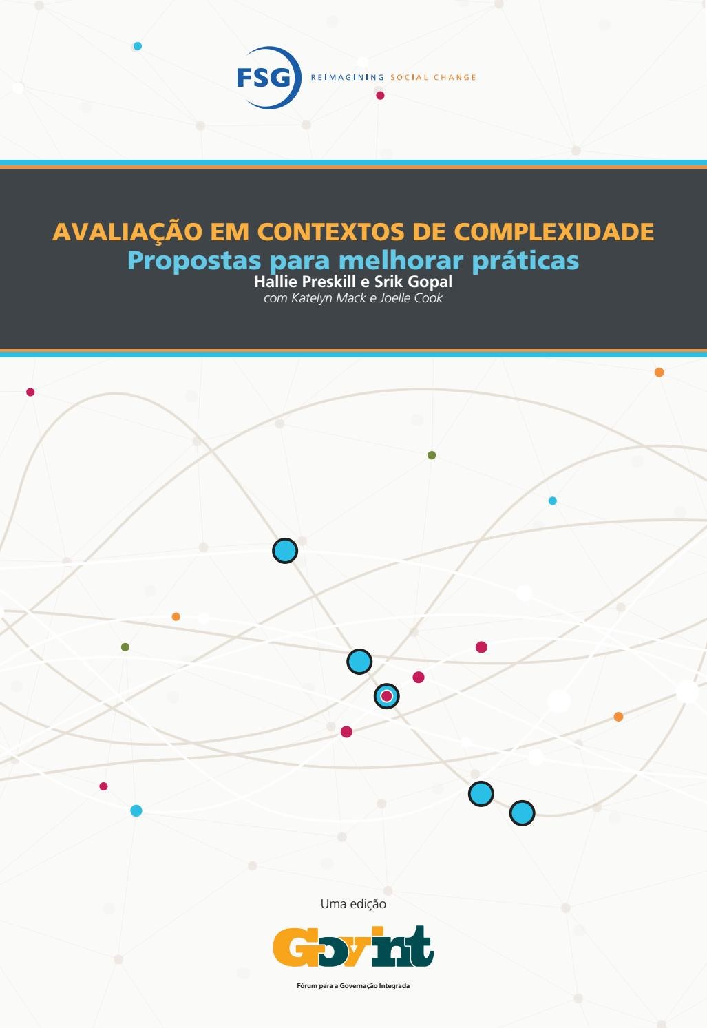 Nota à edição portuguesa Esta edição do manual “Avaliação em contextos de complexidade: Propostas para melhorar práticas” resulta de uma iniciativa do Fórum para a Governação Integrada (www.forumgovernacaointegrada. pt), enquadrada na atenção aos fatores críticos de sucesso para a governação integrada. O Fórum para a Governação Integrada agradece à FSG a permissão para a tradução para língua portuguesa do presente documento por ocasião da IIIª Conferência Internacional sobre Governação Integrada, dedicada ao tema “Colaborar: missão impossível?”.