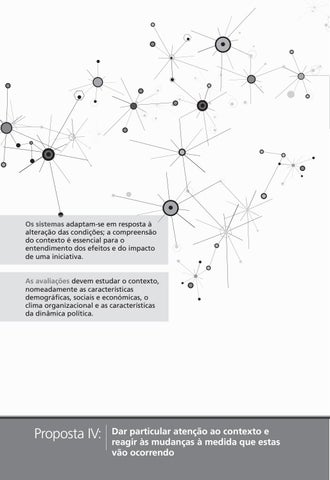 4 Os sistemas adaptam-se em resposta à alteração das condições; a compreensão do contexto é essencial para o entendimento dos efeitos e do impacto de uma iniciativa. As avaliações devem estudar o contexto, nomeadamente as características demográficas, sociais e económicas, o clima organizacional e as características da dinâmica política.