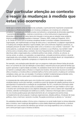 Dar particular atenção ao contexto e reagir às mudanças à medida que estas vão ocorrendo Sendo que o contexto conta na maioria das avaliações, é particularmente importante compreender a natureza e a influência do contexto em iniciativas complexas e em iniciativas em ambientes complexos. O contexto em avaliação envolve normalmente a compreensão de dimensões específicas: “características demográficas, materiais e económicas; o clima institucional e organizacional; dimensões interpessoais ou meios típicos de interação e normas para as relações nesse ambiente; dinâmica política, incluindo questões e interesses” (Greene, 2005, citado por Fitzpatrick, 2012, p. 9). Tendo em conta que as iniciativas complexas tendem a envolver múltiplos intervenientes e organizações, são implementadas ao longo de vários anos e, naturalmente, se adaptam respondendo à mudança de condições (desafios e oportunidades, bem como estímulos negativos e positivos), as avaliações precisam de obter informações sobre como a iniciativa e o seu contexto “coevoluem”. Por outras palavras, a avaliação deve não só estudar o contexto e a sua influência, mas também medir a forma como a iniciativa afeta o contexto. Isto inclui frequentemente a recolha de informações descritivas sobre a organização e/ou o ambiente político mais amplo, a história, as culturas, as normas sociais, os valores, as suposições e as expectativas, a situação económica anterior e atual da organização e/ou comunidade. Adicionalmente, os resultados da avaliação devem ser interpretados e assentes no contexto, registando o progresso e o impacto de uma iniciativa. Por exemplo, uma avaliação pode descobrir que um programa criado para oferecer bolsas de estudo leva a um aumento do custo da habitação na área dada a crescente procura por parte de famílias que querem aproveitar a oportunidade concedida. Os avaliadores teriam de ter este facto em consideração ao fazerem a avaliação sobre a eficácia e o impacto da iniciativa. Este processo recursivo (o contexto afeta a iniciativa e a iniciativa afeta o contexto) tipifica a forma como ocorre a mudança em contextos complexos e deve, por isso, ser estudado. O contexto é também fundamental para entender como, quando, de que forma e para quem a iniciativa pode ser replicada ou escalada. A compreensão das razões pelas quais uma iniciativa tem sucesso numa comunidade e se existem condições básicas noutra (por exemplo, a existência a priori de relações de trabalho positivas entre os participantes) é fundamental na avaliação da complexidade. Por fim, a recolha de informação sólida sobre o contexto de uma iniciativa auxilia os avaliadores a concluírem em que medida e como é que a iniciativa tem contribuído para os seus objetivos desejados, bem como o sistema tem respondido ao contexto, exibindo manifestações de resiliência ou atrofia. Colecionar informação sobre o contexto de uma iniciativa poderá passar pelo desenvolvimento de um cronograma de eventos-chave, nomeadamente de cultura popular, mudanças organizacionais, eleições políticas, introdução de novas políticas, crises a nível local, nacional e mundial, flutuações económicas ou desvios na “narrativa”. Os avaliadores deverão analisar a forma como a imprensa e os social media tratam os temas relevantes para a iniciativa, rever mudanças demográficas e outros dados disponíveis publicamente, e conduzir entrevistas com uma amostra de indivíduos que tenham uma longa experiência com a iniciativa ou com o tema principal a que a iniciativa se destina.