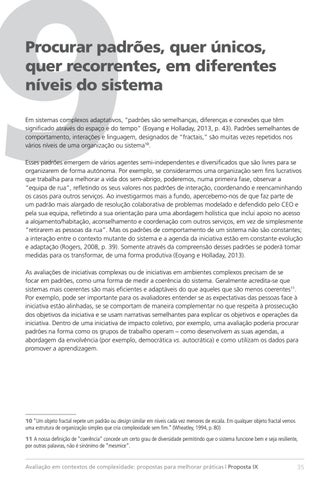 Procurar padrões, quer únicos, quer recorrentes, em diferentes níveis do sistema Em sistemas complexos adaptativos, “padrões são semelhanças, diferenças e conexões que têm significado através do espaço e do tempo” (Eoyang e Holladay, 2013, p. 43). Padrões semelhantes de comportamento, interações e linguagem, designados de “fractais,” são muitas vezes repetidos nos vários níveis de uma organização ou sistema10. Esses padrões emergem de vários agentes semi-independentes e diversificados que são livres para se organizarem de forma autónoma. Por exemplo, se considerarmos uma organização sem fins lucrativos que trabalha para melhorar a vida dos sem-abrigo, poderemos, numa primeira fase, observar a “equipa de rua”, refletindo os seus valores nos padrões de interação, coordenando e reencaminhando os casos para outros serviços. Ao investigarmos mais a fundo, apercebemo-nos de que faz parte de um padrão mais alargado de resolução colaborativa de problemas modelado e defendido pelo CEO e pela sua equipa, refletindo a sua orientação para uma abordagem holística que inclui apoio no acesso a alojamento/habitação, aconselhamento e coordenação com outros serviços, em vez de simplesmente “retirarem as pessoas da rua”. Mas os padrões de comportamento de um sistema não são constantes; a interação entre o contexto mutante do sistema e a agenda da iniciativa estão em constante evolução e adaptação (Rogers, 2008, p. 39). Somente através da compreensão desses padrões se poderá tomar medidas para os transformar, de uma forma produtiva (Eoyang e Holladay, 2013). As avaliações de iniciativas complexas ou de iniciativas em ambientes complexos precisam de se focar em padrões, como uma forma de medir a coerência do sistema. Geralmente acredita-se que sistemas mais coerentes são mais eficientes e adaptáveis do que aqueles que são menos coerentes11. Por exemplo, pode ser importante para os avaliadores entender se as expectativas das pessoas face à iniciativa estão alinhadas, se se comportam de maneira complementar no que respeita à prossecução dos objetivos da iniciativa e se usam narrativas semelhantes para explicar os objetivos e operações da iniciativa. Dentro de uma iniciativa de impacto coletivo, por exemplo, uma avaliação poderia procurar padrões na forma como os grupos de trabalho operam – como desenvolvem as suas agendas, a abordagem da envolvência (por exemplo, democrática vs. autocrática) e como utilizam os dados para promover a aprendizagem.