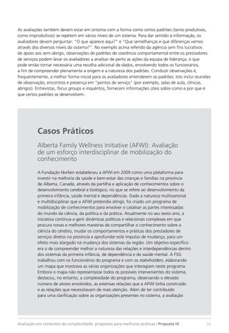 Casos Práticos Alberta Family Wellness Initiative (AFWI): Avaliação de um esforço interdisciplinar de mobilização do conhecimento A Fundação Norlien estabeleceu a AFWI em 2009 como uma plataforma para investir na melhoria da saúde e bem-estar das crianças e famílias na província de Alberta, Canadá, através da partilha e aplicação de conhecimentos sobre o desenvolvimento cerebral e biológico, no que se refere ao desenvolvimento da primeira infância, saúde mental e dependências. Dada a natureza multissetorial e multidisciplinar que a AFWI pretendia atingir, foi criado um programa de mobilização de conhecimentos para envolver e catalisar as partes interessadas do mundo da ciência, da política e da prática. Atualmente no seu sexto ano, a iniciativa continua a gerir dinâmicas políticas e relacionais complexas em que procura novas e melhores maneiras de compartilhar o conhecimento sobre a ciência do cérebro, mudar os comportamentos e práticas dos prestadores de serviços diretos na província e aprofundar este impulso de mudança, para um efeito mais alargado na mudança dos sistemas da região. Um objetivo específico era o de compreender melhor a natureza das relações e interdependências dentro dos sistemas da primeira infância, de dependência e de saúde mental. A FSG trabalhou com os funcionários do programa e com os stakeholders, elaborando um mapa que mostrava as várias organizações que interagiam neste programa. Embora o mapa não representasse todos os possíveis intervenientes do sistema, destacou, no entanto, a complexidade do programa, observando o elevado número de atores envolvidos, as extensas relações que a AFWI tinha construído e as relações que necessitavam de mais atenção. Além de ter contribuído para uma clarificação sobre as organizações presentes no sistema, a avaliação