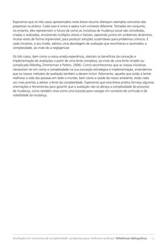 Esperamos que os três casos apresentados neste breve resumo ofereçam exemplos concretos das propostas na prática. Cada caso é único e opera num contexto diferente. Tomados em conjunto, no entanto, eles representam o futuro de como as iniciativas de mudança social são concebidas, criadas e realizadas, envolvendo múltiplos atores e fatores, operando juntos em ambientes dinâmicos, muitas vezes de forma imprevisível, para produzir soluções sustentáveis para problemas crónicos. E cada iniciativa, a seu modo, adotou uma abordagem de avaliação que reconheceu e acomodou a complexidade, ao invés de a negligenciar. Os três casos, bem como a nossa ampla experiência, atestam os benefícios da conceção e implementação de avaliações a partir de uma lente complexa, ao invés de uma lente simples ou complicada (Westley, Zimmerman e Patton, 2006). Como reconhecemos que as nossas iniciativas necessitam ter em conta a complexidade na sua conceção estratégica e implementação, entendemos que os nossos métodos de avaliação também a devam incluir. Felizmente, aqueles que estão a tentar melhorar a vida das pessoas em todo o mundo, bem como a saúde do nosso ambiente, estão cada vez mais prontas a adotar a lente da complexidade. Esperamos que esta breve prática forneça algumas orientações e ferramentas para garantir que a avaliação não só abraça a complexidade do processo de mudança, como também sirva como uma bússola para navegar em contexto de confusão e de volatilidade da mudança.