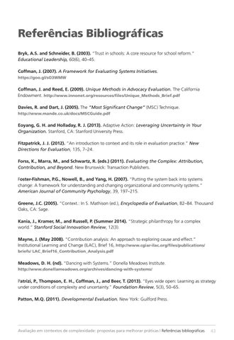 Referências Bibliográficas Bryk, A.S. and Schneider, B. (2003). “Trust in schools: A core resource for school reform.” Educational Leadership, 60(6), 40–45. Coffman, J. (2007). A Framework for Evaluating Systems Initiatives. https://goo.gl/sO3WMW