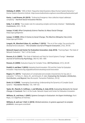 Langois, M., Blanchet-Cohen, N., and Beer, T. (2013). “The art of the nudge: Five practices for developmental evaluators.” The Canadian Journal of Program Evaluation, 27(2), 39–59. Network Impact and Center for Evaluation Innovation. (July 2014). “Framing Paper: The State of Network Evaluation.” Part 1 of the Guide. Parsons, B. A. (2007). “The State of Methods and Tools for Social Systems Change.” American Journal of Community Psychology, 39(3–4), 405 –409. Parsons, B. (2009). Evaluative Inquiry for Complex Times. OD Practitioner, 41(1), 44–49. Preskill, H. and Beer, T. (2012). Evaluating Social Innovation. FSG and the Center for Evaluation Innovation. http://www.fsg.org/publications/evaluating-social-innovation Rogers, P. J. (2011). “Implications of complicated and complex characteristics for key asks in evaluation.” In Forss, K., Marra, M., and Schwartz, R. (eds.) Evaluating the Complex: Attribution, Contribution, and Beyond, New Brunswick: Transaction Publishers, 33–52. Stroh, D. P. (2009). “Leveraging Grantmaking: Understanding the Dynamics of Complex Social Systems.” Foundation Review, 1(3), 109–122. Taylor, M., Plastrik, P., Coffman, J. and Whatley, A. (July 2014). Evaluating Networks for Social Change: A Casebook. Part 2 of the Guide. Network Impact and Center for Evaluation Innovation. Williams, B., and Iman, I. (2007). Systems Concepts in Evaluation: An Expert Anthology. Point Reyes, CA: EdgePress of Inverness. Williams, B. and van ‘t Hof, S. (2014). Wicked solutions: A systems approach to complex problems. www.gum.co/wicked