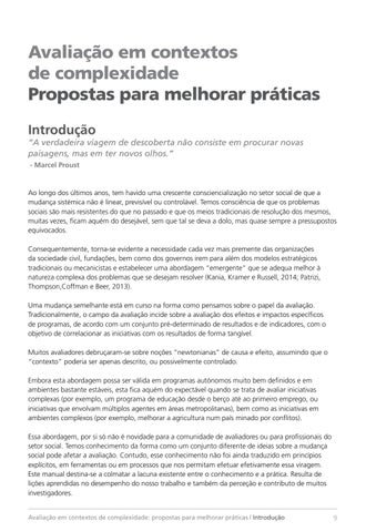 Ao longo dos últimos anos, tem havido uma crescente consciencialização no setor social de que a mudança sistémica não é linear, previsível ou controlável. Temos consciência de que os problemas sociais são mais resistentes do que no passado e que os meios tradicionais de resolução dos mesmos, muitas vezes, ficam aquém do desejável, sem que tal se deva a dolo, mas quase sempre a pressupostos equivocados. Consequentemente, torna-se evidente a necessidade cada vez mais premente das organizações da sociedade civil, fundações, bem como dos governos irem para além dos modelos estratégicos tradicionais ou mecanicistas e estabelecer uma abordagem “emergente” que se adequa melhor à natureza complexa dos problemas que se desejam resolver (Kania, Kramer e Russell, 2014; Patrizi, Thompson,Coffman e Beer, 2013). Uma mudança semelhante está em curso na forma como pensamos sobre o papel da avaliação. Tradicionalmente, o campo da avaliação incide sobre a avaliação dos efeitos e impactos específicos de programas, de acordo com um conjunto pré-determinado de resultados e de indicadores, com o objetivo de correlacionar as iniciativas com os resultados de forma tangível. Muitos avaliadores debruçaram-se sobre noções “newtonianas” de causa e efeito, assumindo que o “contexto” poderia ser apenas descrito, ou possivelmente controlado. Embora esta abordagem possa ser válida em programas autónomos muito bem definidos e em ambientes bastante estáveis, esta fica aquém do expectável quando se trata de avaliar iniciativas complexas (por exemplo, um programa de educação desde o berço até ao primeiro emprego, ou iniciativas que envolvam múltiplos agentes em áreas metropolitanas), bem como as iniciativas em ambientes complexos (por exemplo, melhorar a agricultura num país minado por conflitos). Essa abordagem, por si só não é novidade para a comunidade de avaliadores ou para profissionais do setor social. Temos conhecimento da forma como um conjunto diferente de ideias sobre a mudança social pode afetar a avaliação. Contudo, esse conhecimento não foi ainda traduzido em princípios explícitos, em ferramentas ou em processos que nos permitam efetuar efetivamente essa viragem. Este manual destina-se a colmatar a lacuna existente entre o conhecimento e a prática. Resulta de lições aprendidas no desempenho do nosso trabalho e também da perceção e contributo de muitos investigadores. Avaliação em contextos de complexidade: propostas para melhorar práticas | Introdução