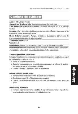 Cantinho do cuidador Área de intervenção: Saúde Outras áreas de intervenção: Desenvolvimento de Competências Área geográfica de impacto: Concelho de Évora, sub-região NUTS III Alentejo Central Entidade: UCC - Unidade de Cuidados na Comunidade de Évora e Agrupamento de Centros de Saúde do Alentejo Central Nome do Empreendedor e Função: Unidade de Cuidados na Comunidade de Évora (responsável projeto: Ana Carla Coelho) A funcionar desde: 2010 Website: n.d. Beneficiários: Diretos: cuidadores informais. Indiretos: utentes em domicílio Problema identificado: Sobrecarga dos cuidadores informais; défice de conhecimentos sobre autocuidado e cuidados aos dependentes a seu cargo