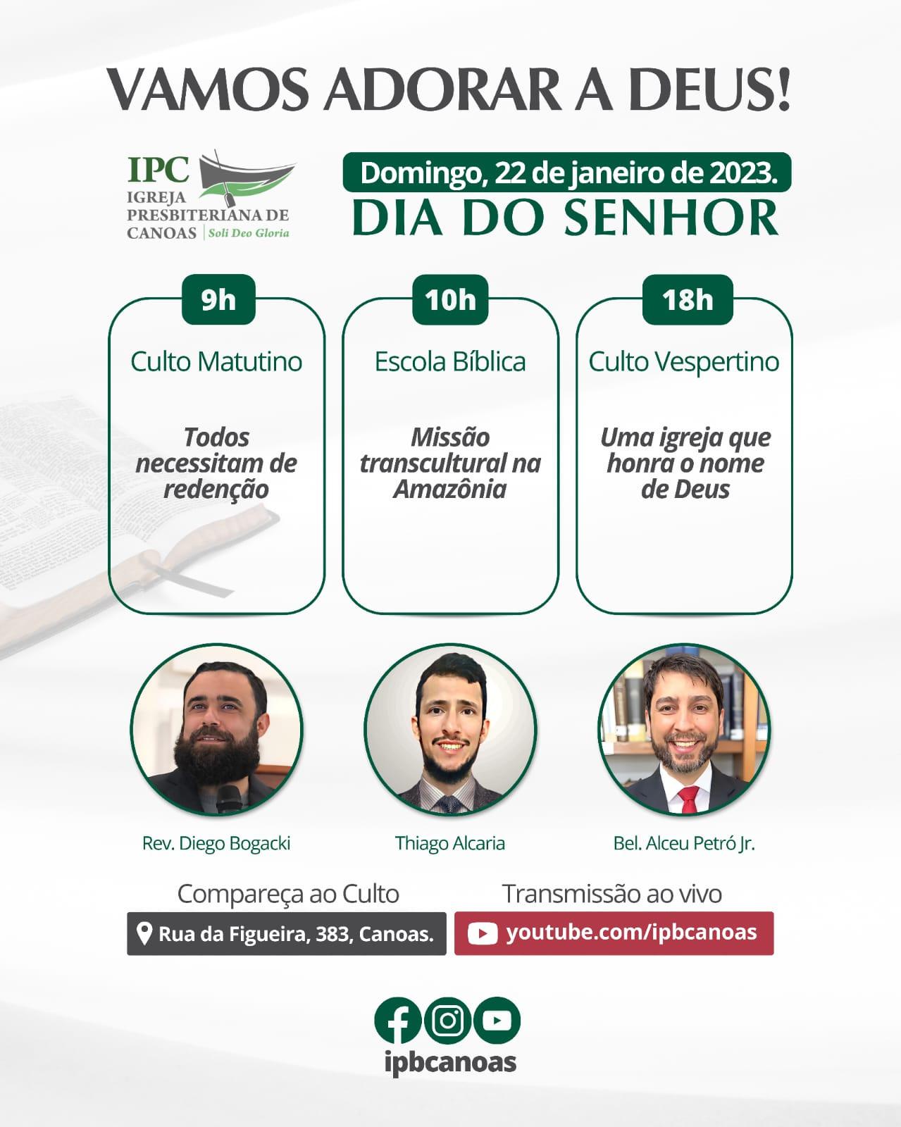 CULTO SOLENE AO SENHOR DOMINGO, 22 DE JANEIRO DE 2023, 18H.
