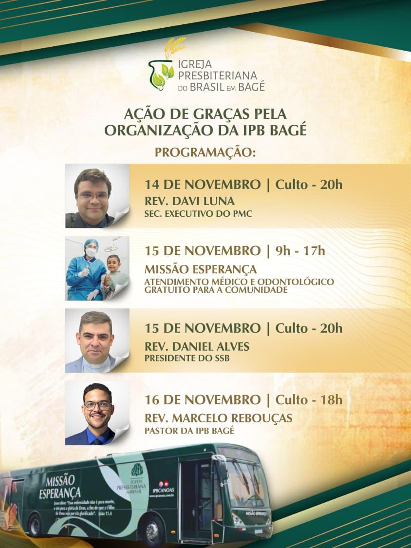 Neste mês faremos duas ações com o Missão Esperança no dia 08/11 em Santana do Livramento e no dia 15/11 em Bagé. Prontifique-se e una-se aos membros do corpo de Cristo que serão instrumentos de Deus na vida de outras pessoas.
