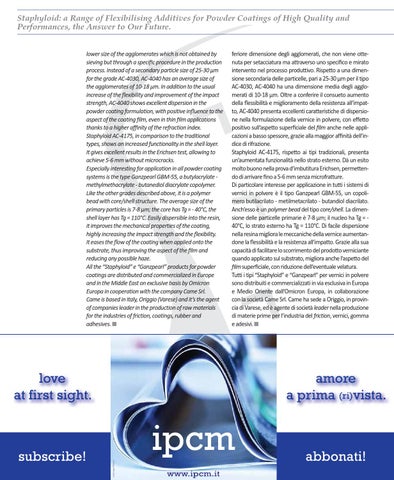 feriore dimensione degli agglomerati, che non viene ottenuta per setacciatura ma attraverso uno specifico e mirato intervento nel processo produttivo. Rispetto a una dimensione secondaria delle particelle, pari a 25-30 μm per il tipo AC-4030, AC-4040 ha una dimensione media degli agglomerati di 10-18 μm. Oltre a conferire il consueto aumento della flessibilità e miglioramento della resistenza all’impatto, AC-4040 presenta eccellenti caratteristiche di dispersione nella formulazione della vernice in polvere, con effetto positivo sull’aspetto superficiale del film anche nelle applicazioni a basso spessore, grazie alla maggior affinità dell’indice di rifrazione. Staphyloid AC-4175, rispetto ai tipi tradizionali, presenta un’aumentata funzionalità nello strato esterno. Dà un esito molto buono nella prova d’imbutitura Erichsen, permettendo di arrivare fino a 5-6 mm senza microfratture. Di particolare interesse per applicazione in tutti i sistemi di vernici in polvere è il tipo Ganzpearl GBM-55, un copolimero butilacrilato - metilmetacrilato - butandiol diacrilato. Anch’esso è un polymer bead del tipo core/shell. La dimensione delle particelle primarie è 7-8 μm; il nucleo ha Tg = 40°C, lo strato esterno ha Tg = 110°C. Di facile dispersione nella resina migliora le meccaniche della vernice aumentandone la flessibilità e la resistenza all’impatto. Grazie alla sua capacità di facilitare lo scorrimento del prodotto verniciante quando applicato sul substrato, migliora anche l’aspetto del film superficiale, con riduzione dell’eventuale velatura. Tutti i tipi “Staphyloid” e “Ganzpearl” per vernici in polvere sono distribuiti e commercializzati in via esclusiva in Europa e Medio Oriente dall’Omicron Europa, in collaborazione con la società Came Srl. Came ha sede a Origgio, in provincia di Varese, ed è agente di società leader nella produzione di materie prime per l’industria del friction, vernici, gomma e adesivi.