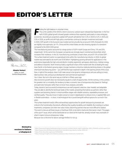 The surface treatment sector offers extraordinary opportunities for growth because its processes are critical to the functionality of products, affecting their quality, durability, and reliability. By investing in surface treatments, companies can enter new value chains, becoming partners that are more difficult to replace. The event to discuss all these issues is PaintExpo 2026, to be held in Karlsruhe (Germany) in April. The pages of this ipcm® issue, which will be distributed at our stand at the trade fair, already include many examples of what it means to be an entrepreneur today.