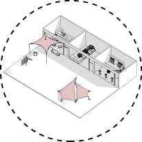 Der Gemeinschaftsraum zieht sich als öffentliche „Straße“ durch jedes Geschoss. Die Wohnzellen definieren gemeinsame „Plätze“. Da befinden sich die gemeinsame Küchen. Die Fläche ist offen und definiert mit Küchen und Gemeinschaftsraum. Die Erschließung passiert sowohl auf dem Laubengang als auch auf den Erschließungskernen.