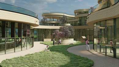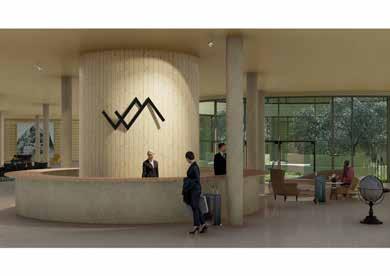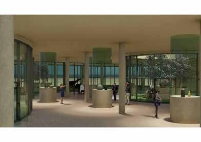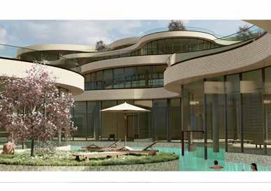 Die gebogene Gestaltung der Stützwand aus dem gelben Kalkstein bietet einen Vorteil bei der Kraftumlenkung. Im untersten Geschoss befinden sich die Schwimmbäder. Außenbad und Innenbad wird mit einer Schwimmbadschleuse miteinander verbunden und dadurch entsteht in der Mitte dieser Etage eine Oase. Bei dieser Etage steht die flexible Konstruktion aus Stahlbetonstützen, die 7 m voneinander entfernt sind, im Vordergrund und beim Rohbauzustand wirkt das System wie ein Stützenwald.