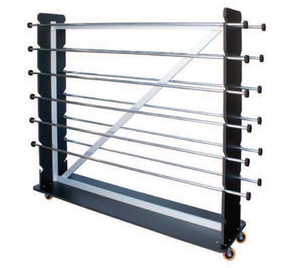 Struttura autoportante con ruote realizzata con telaio in profili di alluminio da cm 5, supporti laterali e base in pvc spessore mm 19 Le 12 aste in alluminio sono facilmente amovibili per caricare e scaricare velocemente le bobine Nostra produzione, altre misure e varianti su richiesta