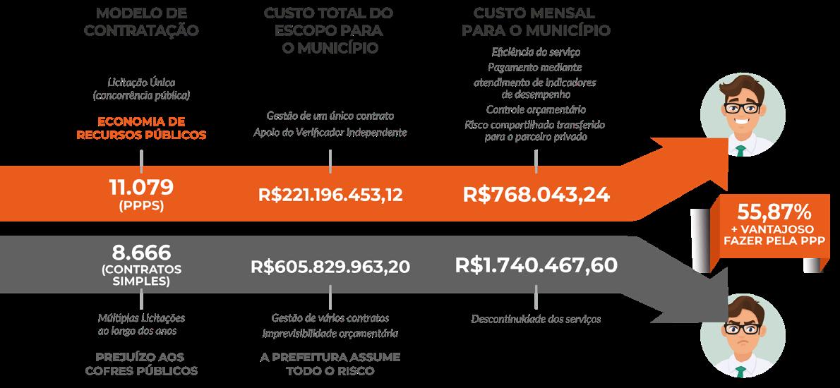 O que fica evidenciado nas análises de custo-benefício a partir dos modelos de contratação com respaldo da lei 8.666 e na lei 11.079 é que, se bem avaliados, alguns objetos — por essência — são altamente indicados para a contratação através dos arranjos de parcerias, a julgar por sua complexidade, singularidade e riscos envolvidos em sua execução. Enquanto isso, o arranjo de contratação convencional precisa acabar por expandir as demandas gerenciais e custos burocráticos, culminando em maior gasto público no longo prazo. Financeiro entre a contratação do mesmo escopo sob o regime da lei 8.666/93 e o modelo com base na lei 11.079/04 em relação aos valores da licitação.