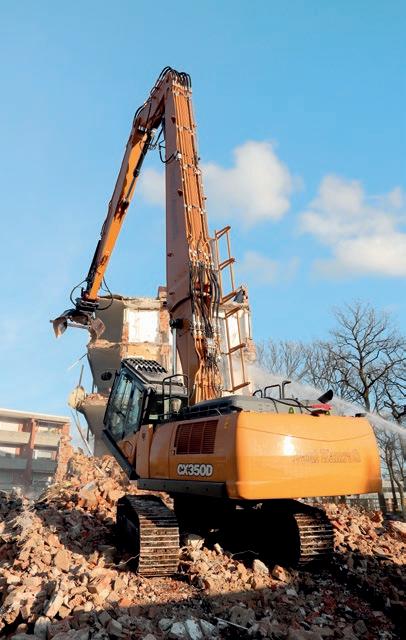 Demolition of tall buildings with traditional excavators can often present issues. Fitting the machine with a 21-metrelong extended arm is one way to tackle this, as German-based paul Kamrath ingenieurrückbau GmbH recently demonstrated with a CX350D.