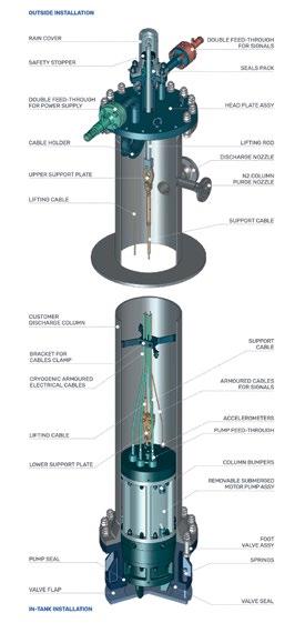 In contrast to the ARTIKA Series, which is mounted directly at the bottom of the tank or inside a cryostat, the eSK-IMO retractable pump is installed inside a column that is isolated from the rest of the tank by a foot valve. In this way, the liquefied natural gas remains confined in the tank outside the column, allowing the pump to be removed by opening a cover at the top of the column.
