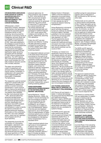 advanced adenomas, for which sensitivity was increased by 35%, while sensitivity for CRC and advanced serrated polyps did not change. The improved sensitivity for advanced adenomas may prove critical to improving FIT's performance as a cancer prevention test. The authors estimate that when performed biennially and compared to traditional biennial FIT, mtFIT would reduce CRC incidence and mortality by 12% and 8%, respectively, assuming 73% adherence. Finally, the mtFIT was also deemed cost-effective. Funding has been secured to conduct a prospective screening trial to further validate mtFIT within the context of the Dutch CRC screening program. An independent editorial comment in the same issue of the journal commented on the study to be "important because the challenge of building a better screening test was approached from the perspective of an organized, population-based screening program, and it shows the potential of relatively inexpensive enhancements to the widely used FIT to improve sensitivity without sacrificing specificity" and "Ultimately, this study offers promise of incremental but important improvements in the effectiveness of population-based CRC screening through novel biomarker measurement using an existing screening platform." HANSA BIOPHARMA ANNOUNCES REIMBURSEMENT IN THE NETHERLANDS OF IDEFIRIX® (IMLIFIDASE) Hansa Biopharma, “Hansa” (Nasdaq Stockholm: HNSA), the pioneer in enzyme technology for rare immunological conditions, has announced that its firstin-class treatment Idefirix® (imlifidase) is, as of August 1, reimbursable and available for use in the Netherlands. Idefirix® is the first and only treatment approved for use in the European Union for desensitization of highly sensitized patients prior to kidney transplantation, allowing them to be considered for a life-altering kidney transplantation from a deceased donor. “Highly sensitized patients have high levels of immunoglobulin G against many human leukocyte antigens that can cause tissue damage and potentially transplant rejection.” says Dr Annelies de Weerd, nephrologist at the Erasmus